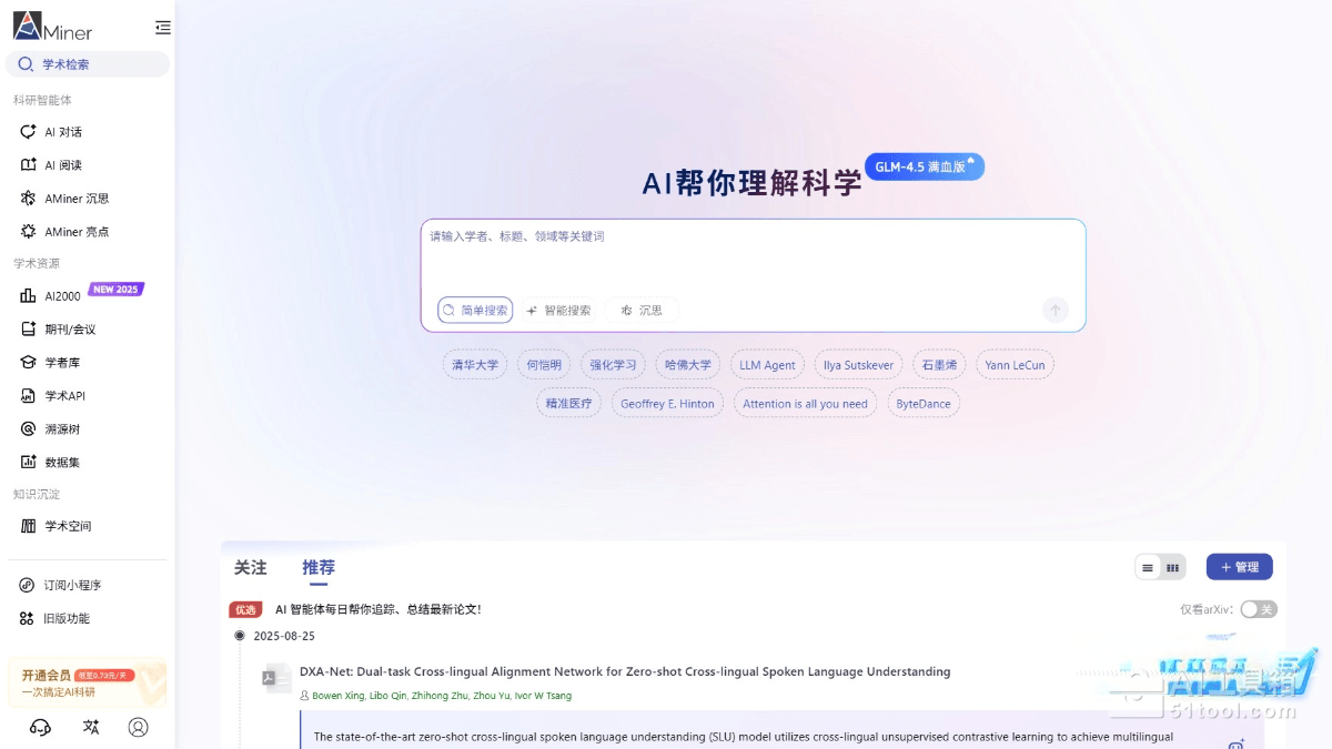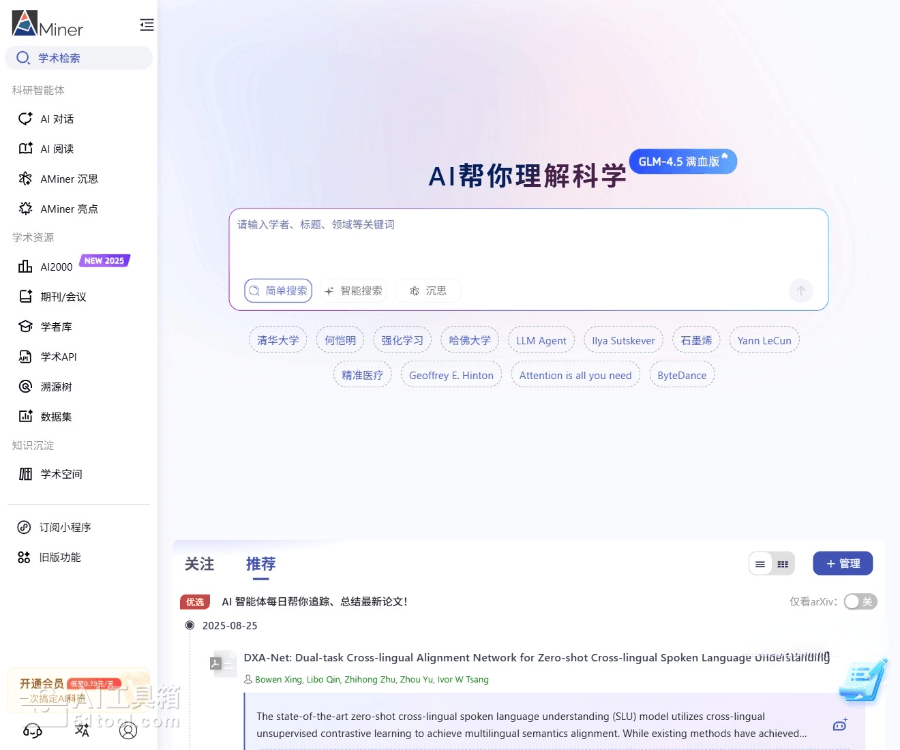 AMiner是具备我国自主知识产权的智能科技情报大数据挖掘服务平台,融合广泛而丰富的科研资源,包括6000万学者、3.2亿篇论文、1.6亿件专利等海量资源,构建百亿级多实体知识图谱。平台是智谱基于GLM-4.5、GLM-4.5 Air 等自研旗舰大模型推出的新一代 AI 科研助手。依托人工智能与数据挖掘技术,AMiner提供学术检索、学术AI对话、科研情报订阅、文献AI阅读等核心功能,覆盖文献综述、开题报告、行业调研等科研场景,助力科研人员、研究生、教师、行业专家和技术开发者高效获取学术资源,提升学术效率与科研创新能力。