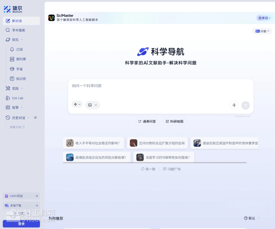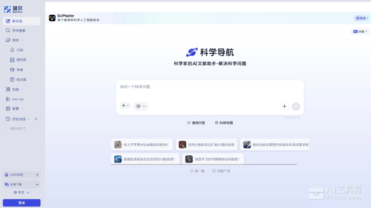 玻尔(Bohrium)是深势科技联合北京科学智能研究院(AISI)推出的全球首个覆盖“读文献-做计算-做实验-多学科协同”的AI科研平台。平台以“科学导航(Science Navigator)”为核心,提供强大的AI学术搜索、多模态搜索能力、个性化推荐、知识库管理等功能,帮助科研人员高效筛选文献、整理数据、发现关键问题。玻尔能重构科研流程,释放科研创造力,让人工智能成为科学发现的真正参与者。