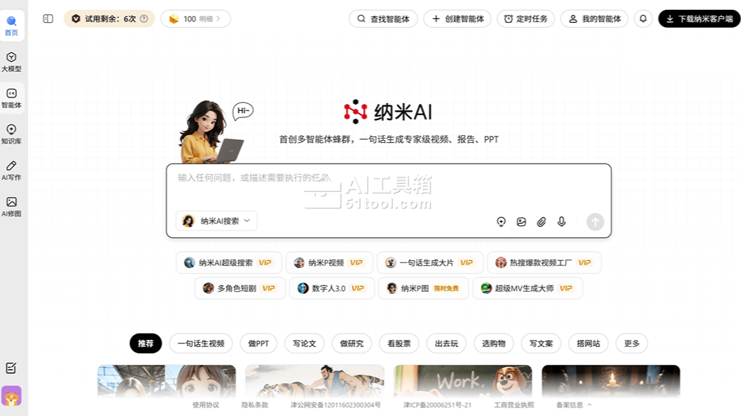 纳米AI是360公司推出的新一代超级AI搜索工具,集搜索、写作和创作于一体,重新定义AI搜索体验,纳米AI提供多模态搜索方式,包括文字、语音、拍照和视频等。纳米AI具备强大的多智能体蜂群系统,能实现多个推理型智能体的灵活协作,完成复杂多步骤任务。纳米AI通过答案引擎、学习引擎、写作引擎和创作引擎四大功能,重新定义AI搜索体验,帮助用户轻松解决各种问题,提高工作和生活的便捷性。广泛应用在内容创作、电商带货、旅行规划等多个场景,帮助用户提高效率,实现智能化任务处理。