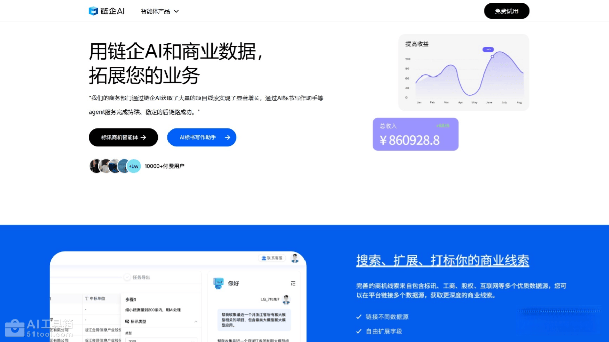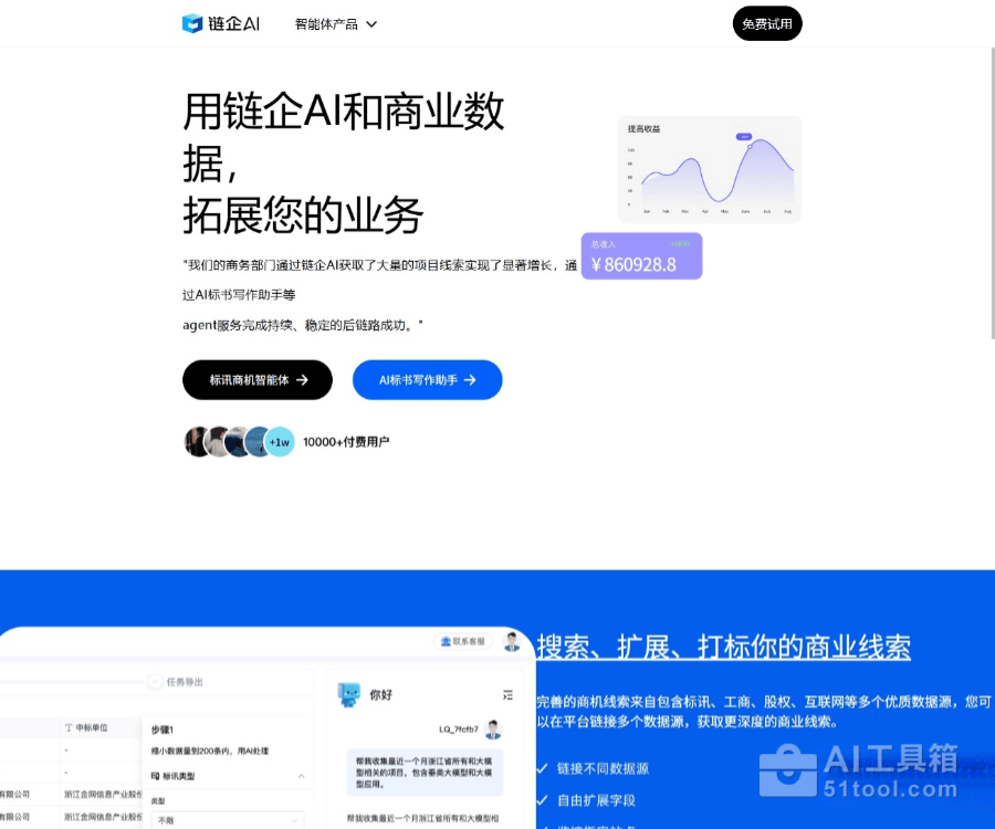 链企AI是链企智能推出的AI商业搜索和AI标书写作工具,由阿里巴巴和浙江省金控联合入股。链企AI基于大模型技术,自建垂类数据索引,提供企业查询、行业查询和商机挖掘服务。链企AI拥有三大智能体,标书智能体,10分钟生成20万字千页标书;标讯智能体,汇聚全网3亿+招投标信息;标无缺智能体,一键审查、美化标书,助力中标。通过自然语言处理和深度学习,链企AI能快速、准确地整合公开数据,帮助用户一键获取全面、专业的商业信息,优化商业查询体验。产品形态包括小程序、APP和Web端,致力于让商业搜索更智能、更高效。