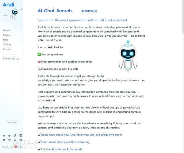 - 隐私至上:Andi AI 尊重并保护用户隐私,不会追踪用户的搜索行为,提供一个安全、私密的搜索体验。