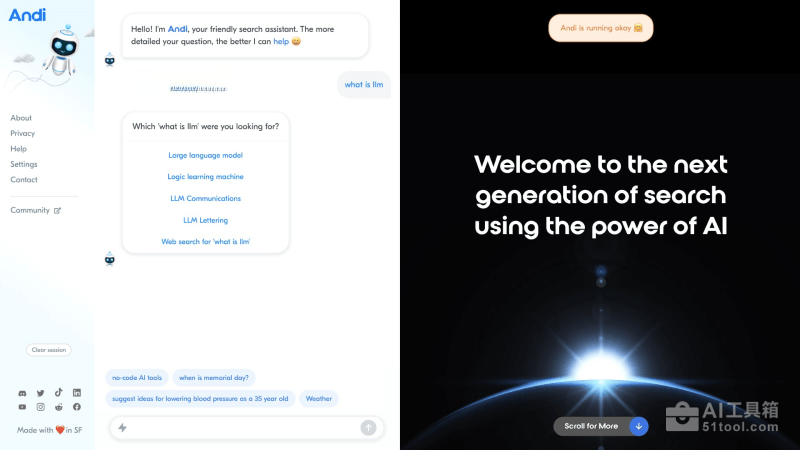 - 隐私至上:Andi AI 尊重并保护用户隐私,不会追踪用户的搜索行为,提供一个安全、私密的搜索体验。