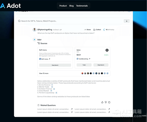 Adot是一个由AI驱动的 Web3 搜索引擎。采用了去中心化架构,不依赖中心服务器,将数据分散存储于多个节点中,增强了数据安全性和隐私保护。Adot引入了激励机制,鼓励用户参与到数据的收集、索引、分析和整理中,用户因此可以获得虚拟货币奖励。Adot的应用场景是为用户在加密货币市场和Web3领域提供深入的洞察和知识。融合了Web2和Web3的数据,包括传统网页、区块链数据、社交媒体数据和Web3交易数据等,为用户提供了一个全面的信息获取平台。