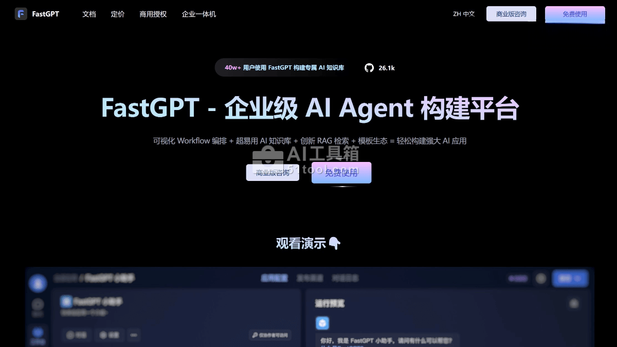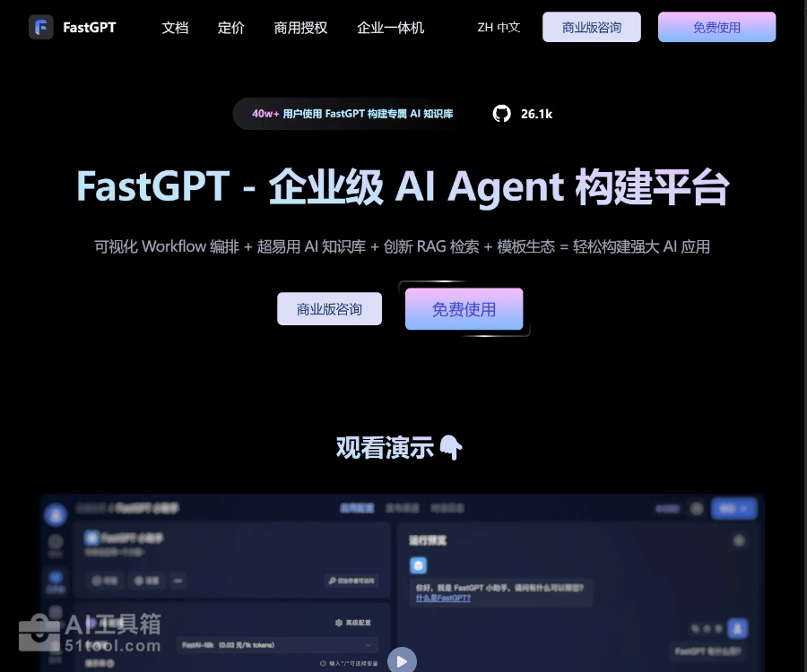 FastGPT 是新一代企业级 AI Agent 构建平台,提供可视化 Workflow 编排能力、超易用的AI知识库,以创新的RAG检索技术,配合强大的模板生态,助力如搭积木一般轻松构建强大的AI应用。主要面向企业行政人事、运营客服及开发工程师,解决一线工作问题。