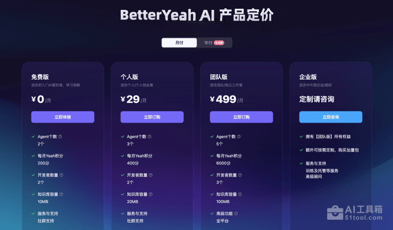 - 免费版:适合个人体验产品功能使用,可免费创建2个Agent,开发者数量上限为2,每月提供200Yeah积分(可运行基础模型200次),知识库容量为10MB,提供社群支持服务