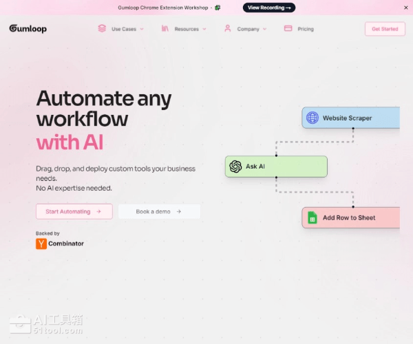 Gumloop是AI零代码工作流平台,通过简单的拖放界面使用户能够创建和部署 AI 驱动的工作流自动化,无需编写代码。核心优势在于易用性和强大的 AI 功能,适合非技术用户快速上手,设计和实施复杂的自动化流程。Gumloop 提供了预定义的自动化模板,支持与多个流行服务的连接,如 Twitter、AWS、GitHub、Outlook、Google 等,支持用户自定义工作流程。Gumloop 提供了 Chrome 扩展程序,用于构建 AI 浏览器自动化。
