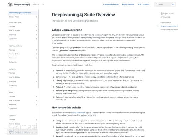 Eclipse Deeplearning4j (DL4J)是基于Java虚拟机 (JVM)的开源深度机器学习框架,专为 Java 和 Scala 开发者设计。Eclipse Deeplearning4j 支持在 Java 环境中训练和部署深度学习模型,同时兼容 Python 生态系统,能导入和再训练 TensorFlow、PyTorch 等模型。Eclipse Deeplearning4j 包含多个子模块,如 Samediff(类似 TensorFlow/PyTorch 的低层次 API)、Nd4j(强大的张量操作库)、Datavec(数据预处理工具)和 Apache Spark 集成,适合用微服务、移动设备、物联网和大数据环境。Deeplearning4j 以 Apache 2.0 许可开源,由 Eclipse 基金会管理。Deeplearning4j能用在训练模型,模型能执行图像分类、对象检测、图像分割、自然语言处理和时间序列预测。