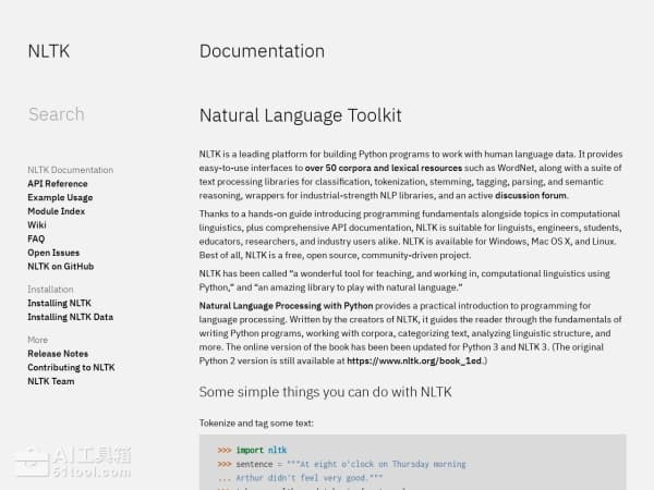 NLTK(Natural Language Toolkit)自然语言工具包是一套开源的Python模块、数据集和教程,专门用在自然语言处理(NLP)。NLTK提供丰富的工具和资源,包括文本分词、词性标注、句法分析、命名实体识别等。NLTK包含大量语料库和词汇资源,如WordNet,方便用户进行语言学研究和开发。NLTK支持Python版本3.7、3.8、3.9、3.10或3.11,适合从初学者到专业人士的各种用户,广泛应用在学术研究、商业应用和教育领域。NLTK的文档齐全,社区活跃,是学习和实践自然语言处理的绝佳工具。