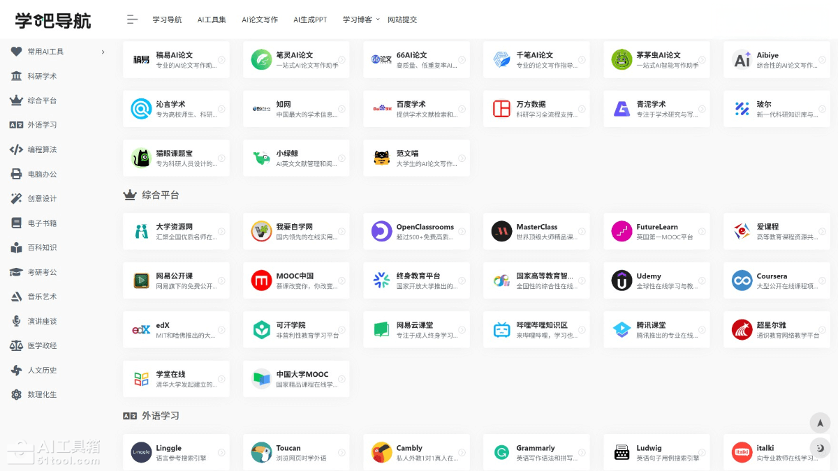 • 综合平台:汇总各类综合学习平台,提供广泛的在线课程和教育资源。