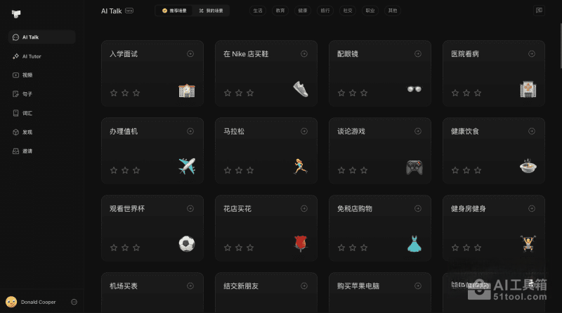 - AI口语教练:内置丰富的的真实口语对话场景,摆脱固定化的口语对话内容,并支持自定义场景
