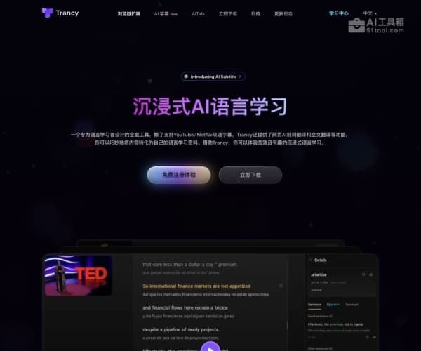 Trancy是一个专为外语学习者设计的网站和浏览器插件,支持通过AI沉浸式学习包括英语、意大利语、德语、西班牙语、韩语等在内的十多种语言。该AI语言学习工具提供YouTube/Netflix视频双语字幕、网页AI划词翻译和全文翻译等功能,用户还可以通过收藏视频、例句和单词,打造个性化的学习资料库,将新语言的习得转变为一种高效而真正愉悦的沉浸式体验。