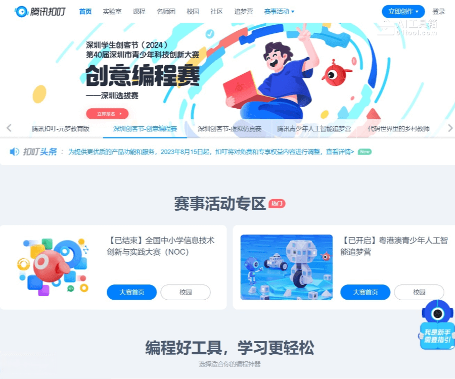 腾讯扣叮是腾讯推出的青少年编程教育平台。基于腾讯在游戏和AI领域的技术优势,为6至18岁的孩子们提供有趣、互动的学习环境,在数字世界中探索和学习编程。平台包括虚拟仿真实验室,支持无实体硬件的编程学习,基于图形化编程工具和仿真场景运行,孩子们能轻松入门、逐步提升编程技能。腾讯扣叮提供丰富的课程内容、赛事活动和创作分享,培养孩子们的计算思维和创新能力。基于平台,孩子们能学习编程,参与到各种编程挑战和创作中,展示才华和创意。