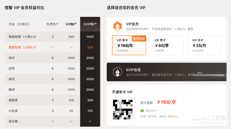 - SVIP超级会员:每日可使用小悟3.5智能助理1000次、小悟4.0智能助理200次;每日校对、改写、续写、翻译各3000次;每日使用模板库300次、AI生成100次