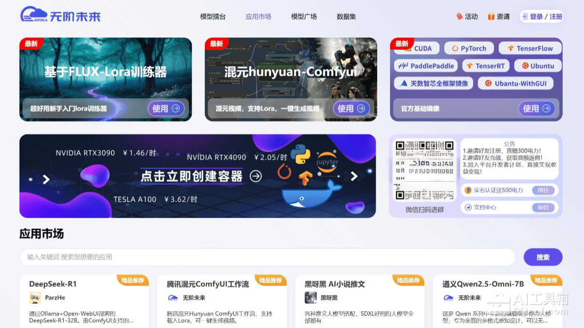 无阶未来是AI应用与弹性算网平台,专注于为用户提供强大的算力支持和丰富的AI应用服务。无阶未来提供多种类型的显卡资源,用户可以根据需求选择合适的资源进行AI应用的训练和部署,弹性算网服务支持用户自行开关机,采用灵活的计费模式,用户只需为实际使用的资源付费。