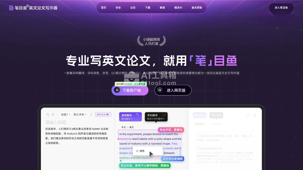笔目鱼英文论文写作器是小绿鲸团队推出的强大AI学术写作辅助工具,专为提升英文论文质量而设计。笔目鱼基于鲸灵AI科研大模型,支持英文润色、翻译、改写、查重和AIGC检测等功能。