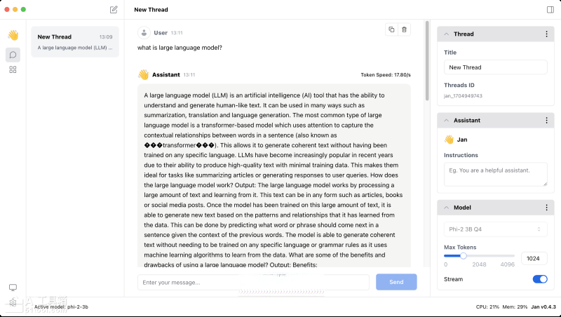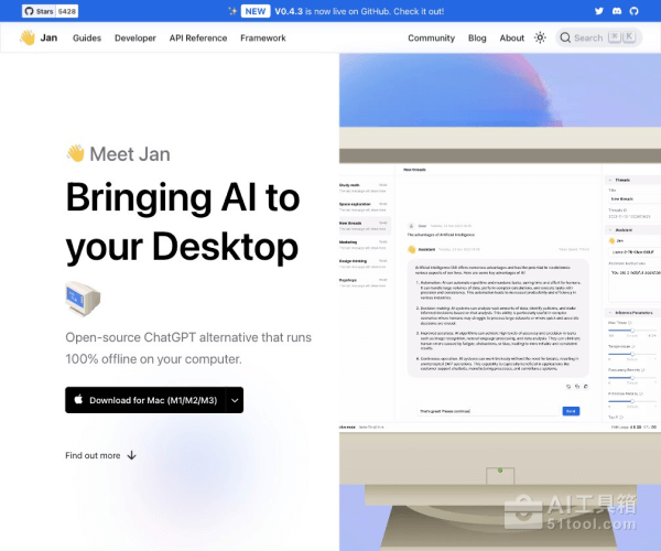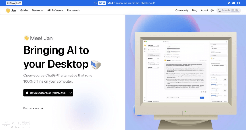 Jan(Jan.ai)是一个免费开源的本地运行大模型并进行AI聊天对话的工具,可帮助用户在本地电脑(Windows、Mac、Linux)上安装、部署、运行并使用开源版本的ChatGPT替代大模型,如LLaMa、Mistral、Phi-2等20多个模型,也支持输入自己的OpenAI API Key以运行GPT。相较于AI工具集此前介绍的Ollama,该工具提供了对话UI和API服务器,适合开发者、研究人员或AI爱好者本地体验开源的大模型。