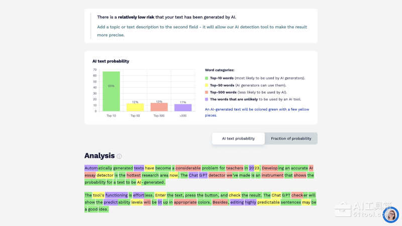 - 详细单词统计分析,单击每个单词,可以看到AI聊天机器人使用该单词的概率。