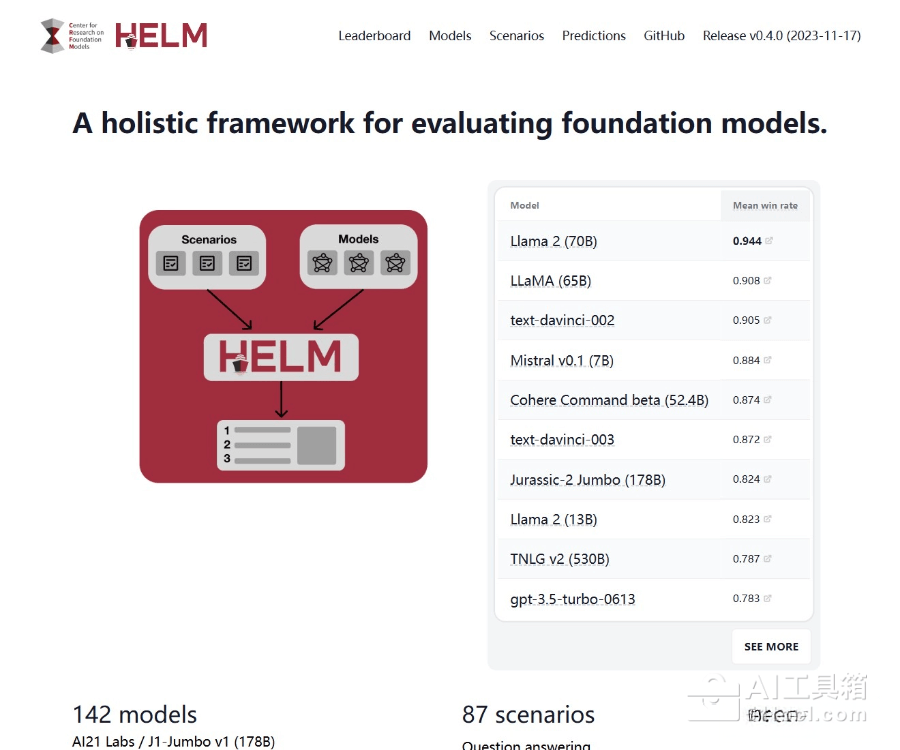 - 全面的评估能力:HELM支持多种语言模型任务(如问答、文本分类、信息检索、文本生成、摘要等),提供多种评估指标(包括准确率、鲁棒性、公平性、偏差、毒性、推断效率等),能够从多个维度全面评估语言模型的性能。