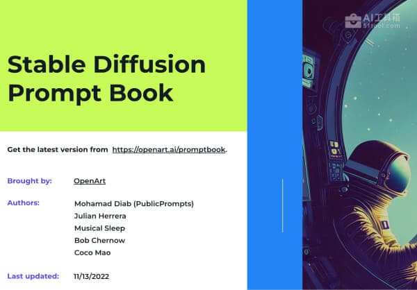 Stable Diffusion Prompt Book是OpenArt平台推出的免费提示词开源指南手册,帮助用户优化Stable Diffusion模型的文本提示。由多位行业专家共同编写,内容涵盖了从基础到高级的提示词构建技巧。书中提供了详细的提示格式示例,通过对比分析展示了语言细节对图像生成效果的影响。收录了丰富的风格化修饰词库,帮助用户快速扩展创作思路。
