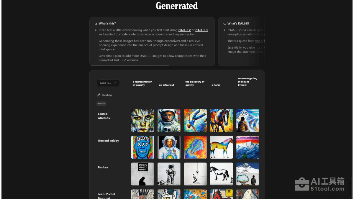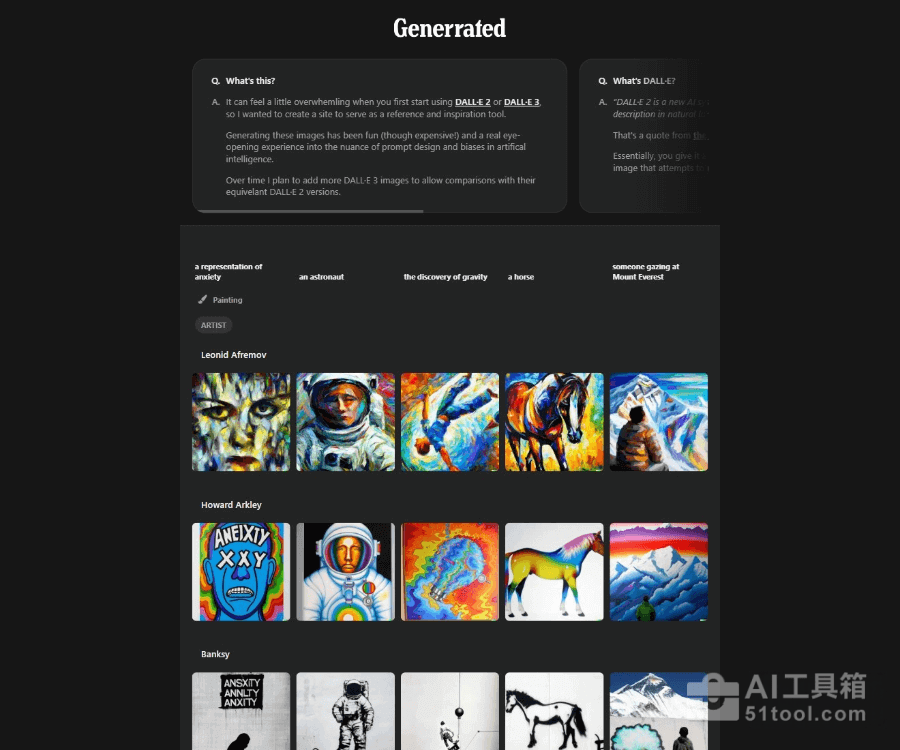 Generrated 是为 DALL·E 2 和 DALL·E 3 用户提供参考与灵感平台。Generrated展示超过 9,300 张由 AI 绘图工具生成的图像,附带生成图像所用的文本提示。用户点击图像能查看提示用语,还能浏览同一提示生成的所有图像,对比不同版本的风格差异。Generrated 帮助新手快速了解如何设计有效提示,减少试错成本,是学习和探索 AI 绘图的实用工具。