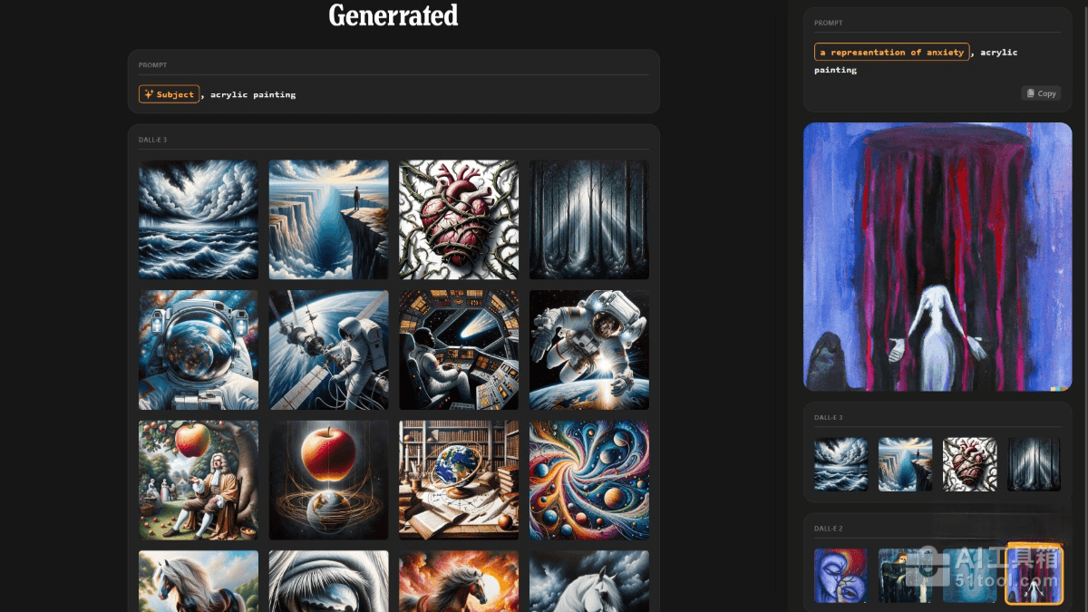 Generrated 是为 DALL·E 2 和 DALL·E 3 用户提供参考与灵感平台。Generrated展示超过 9,300 张由 AI 绘图工具生成的图像,附带生成图像所用的文本提示。用户点击图像能查看提示用语,还能浏览同一提示生成的所有图像,对比不同版本的风格差异。