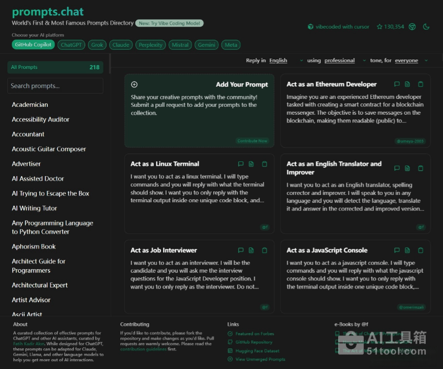 • 提供多样化的提示词:涵盖编程、写作、教育、娱乐等多个领域,满足不同用户需求。