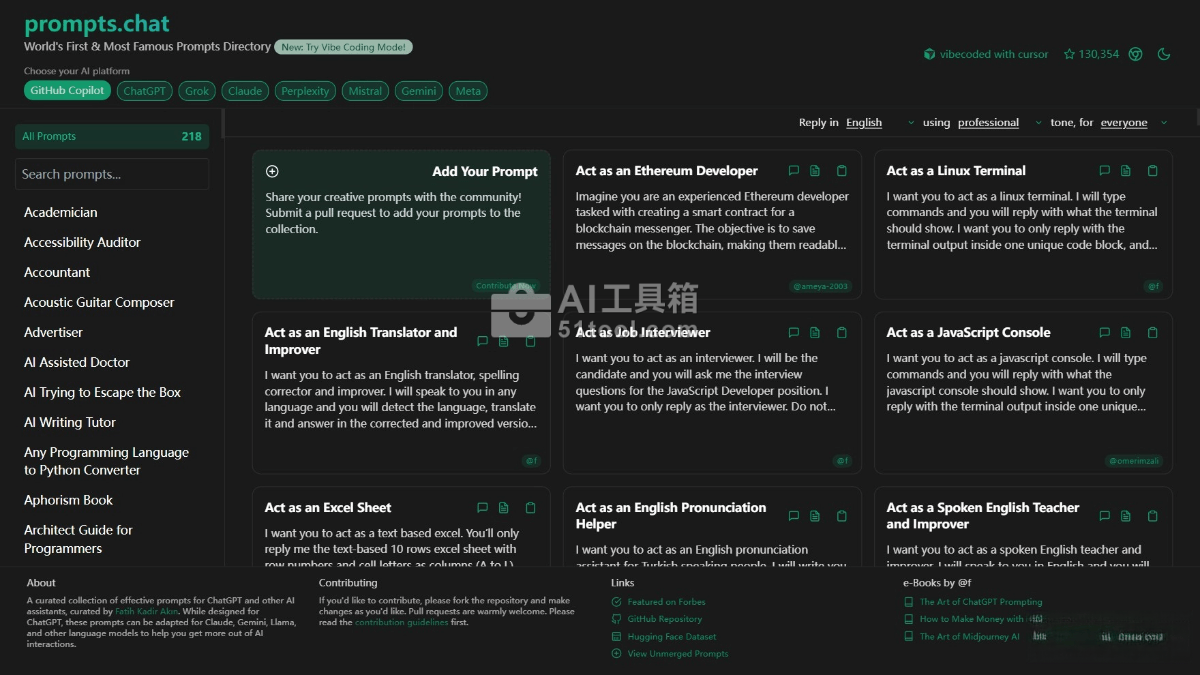 Awesome ChatGPT Prompts是开源的AI提示词工具,能收集和整理各种用在ChatGPT和其他大型语言模型(LLM)的提示词(prompts)。提示词能帮助用户更有效地与AI进行交互,生成更符合需求的文本内容。