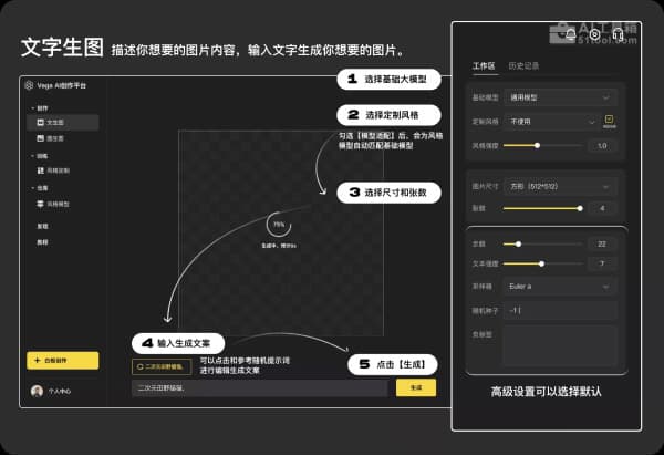 - 文生图:输入文本提示描述,选择风格,即可快速生成高质量图像